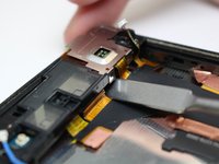 Use a plastic opening tool to pry up the camera's press fit connector in the top left corner of the motherboard.