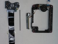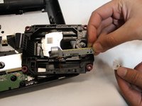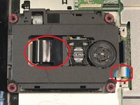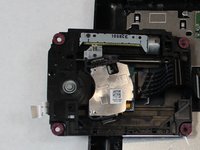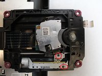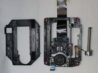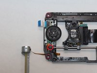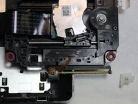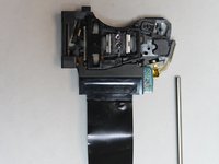 Remove the J0mm Phillips #0 screw which is shown in image one. This screw keeps the metal bar from sliding out. The laser lens is attached to this metal bar on one side and on the other side is the sliding motor.