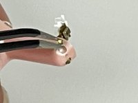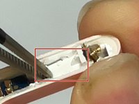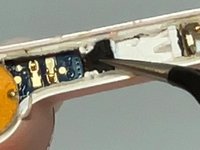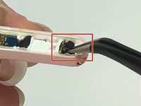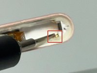 Remove the black rubber cross from the bottom of the earbud with angled tweezers.