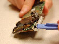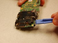 Using the plastic opening tool, pull the white clips of the display away from the printed circuit board to unclip display.