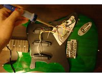 Carefully lift the panel of the guitar and turn it upside down to reveal the electronic components.