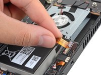Grip the battery cable by its pull tab and pull it directly away from the motherboard to disconnect it.