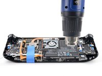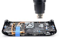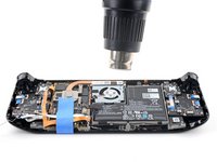 Note: The Steam Deck's battery is strongly adhered, requiring repeated heating and prying cycles. The heat produced by an iOpener may not be sufficient to loosen the adhesive, so a heat gun (or, alternatively, a hair dryer) is recommended for this procedure.