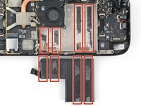 Use your T6 Torx driver to remove the two 3.8 mm‑long screws securing the top left and bottom left corners of the motherboard shield.
