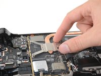 Use an iOpener or hair dryer to soften the adhesive on the black sticker connecting the heat sink to the fan.