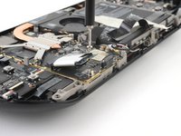 Use your T6 Torx driver to remove the two 3.8 mm‑long screws securing the top left and bottom left corners of the motherboard shield.