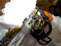 Loosen the nuts on the chain cover with the wrench side of the scrench until the cover comes off of the saw.