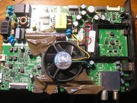 With selected FAN I used the TV's original heatsink again. FAN housing fits flawlessly over the heatsink and inside the TV's rear housing. First trials I did with tape(photo), later I glued the FAN housing with hot glue to the mainboard.