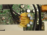 Note that the long leads of the NP caps are soldered directly to the newly installed components; be careful doing this! You don't want to get one lead soldered, and then wedge the whole assembly sideways, or the components will be damaged.