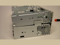 Remove the CD drive, by unscrewing 4 screws: 2 on the front panel underneath the CD slot, and 2 on the sides at the upper rear.