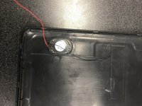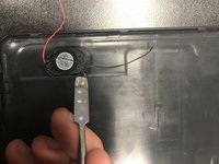 Locate the speaker in the bottom left corner with a red and black wire coming off the speaker and locate a fine bladed wedge, or sharp knife.