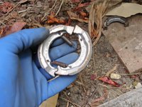 Carefully spread apart the round side of the brake shoes and place them through the round bolt on the brake drum assembly.