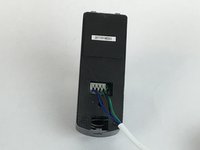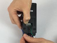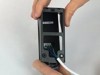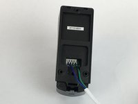 With the back cover of the outdoor camera off, press the first gray square button with blue wire down.