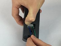 While pressing the gray square button, remove the blue wire from the first opening under the button.