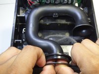place your hands on each side of the air vent and then place your index finger on the thin plastic half circle that holds the vent in place.