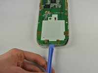 Wedge the small plastic opening tool under the backup battery in the gap to the left of the backup battery.