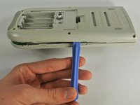 Wedge the large plastic opening tool in the gap at the bottom between the top and bottom covers.