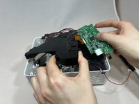 Remove the motherboard and black cover at the same time, being careful not to pull on the gold ribbon.