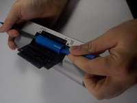 Use the nylon spudger and the plastic opening tool to lift up the battery from the casing. Use the spudger on one side and the plastic opening tool on the other.