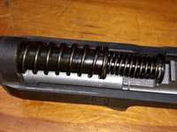 The recoil spring assembly is on the bottom of the barrel. It is held in place by the spring's own tension against a notch in the barrel (2nd picture) and its slot in the end of the slide.