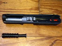 While holding the slide with the muzzle pointing away from you, put your thumb or index finger on the rear-facing portion of the recoil spring assembly. Push the assembly forward to free it from the tension against the barrel, then release the tension and pull it out of its slot in the slide.