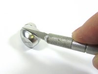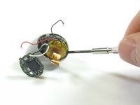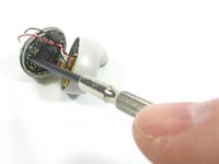 Now we can remove the speaker from the headphone. The speaker is held in place with double side foam tape, so it best to use an Xacto knife to cut around the speaker. Then the speaker can be pried out with a small flathead screw driver