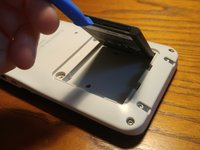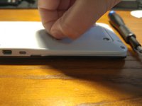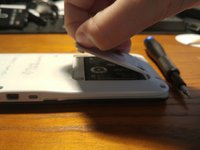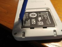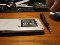 Lift the battery door by grasping one of the two screws that are unscrewed, and pulling upwards.