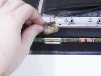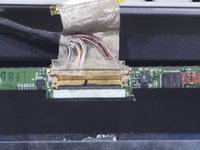 Place the screen face down on the keyboard. The only connection the screen has to the laptop is now its connection cable.There is a piece of tape covering the screen's connection cable. Using the tweezers, remove this tape.