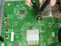 Remove the two 200 mm screws holding the motherboard in place to the bottom of the box using pliers.
