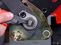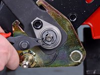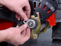 With the new axle hooked over the protruding end of the driveline on the right side of the device, pull the axle left, up, and over the driveline on the left side.