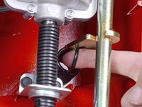 Reach underneath the axle, near the transmission, and pull the axle spring out towards the axle and down to unhook it.