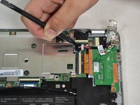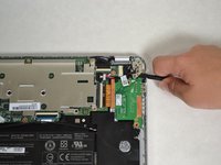 Press down on the white clip with the pointed side of the spudger tool and softly pull the wires out of the socket by pulling horizontally away from the clip to disconnect the charging port from the motherboard.