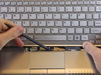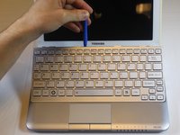 Use the plastic opening tool in little notches above the keyboard