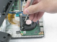 Remove the two 50mm screws holding down the fan using a Phillips #00 screwdriver.