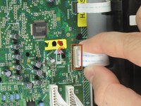 Remove the first of three ribbon cables on left hand side of disc drive by pulling vertically.