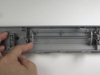 On back side of front panel very carefully apply pressure to the left hand side of the flap hinge.