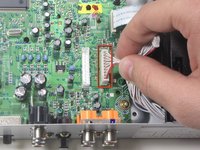 Remove the first of two ribbon cables connected to the motherboard by pulling vertically.