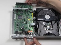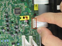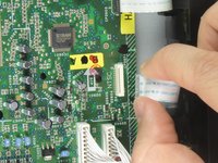 Remove the third of three ribbon cables on the left hand side of the disc drive by pulling vertically.