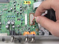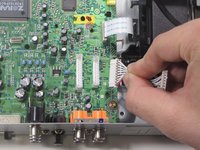 Remove the first of three ribbon cables on the left hand side of the disc drive by pulling vertically.