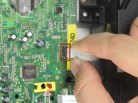 Remove the first of two multipin cables connected to the Left-Side Motherboard (Green) by pulling vertically.