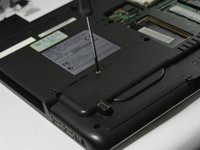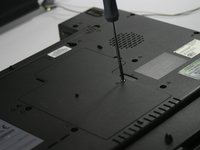 Turn the laptop over and locate the lock and battery release switches. Unlock the battery by changing the switch on the right from locked to unlocked by sliding the switch outward.