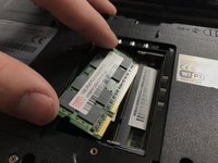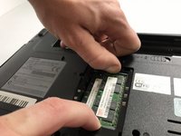 Press the silver tabs away from the RAM stick to remove it. Both RAM modules can be removed using this technique.