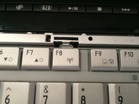 Find the strip just above the keyboard and locate the gaps behind the F1, F8, and Insert keys.