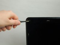 Unscrew all four 5mm screws located underneath the stickers in each corner of the computer frame.
