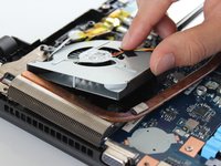 Maneuver the fan's bottom left corner above the copper heat sink.