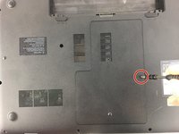 Remove the 7mm screw near the center of the back of the laptop with a P1 screwdriver and pry off the access panel with a nylon spudger.
