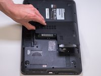 Use two fingers to pull the ridged lock tabs on the bottom of the computer toward the edges. This will unlock the battery.