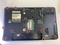 Remove the twelve 6 mm screws from the back of the laptop with a Phillips #00 screwdriver.