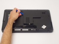 Wedge the plastic opening tool between the back panel and the hard drive/RAM panel near the screw.
