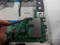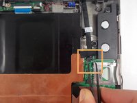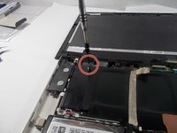 Trace the black ribbon cable that begins on the right of the screen. This cable is connected to the upper part of the motherboard, which is located near the right speaker.